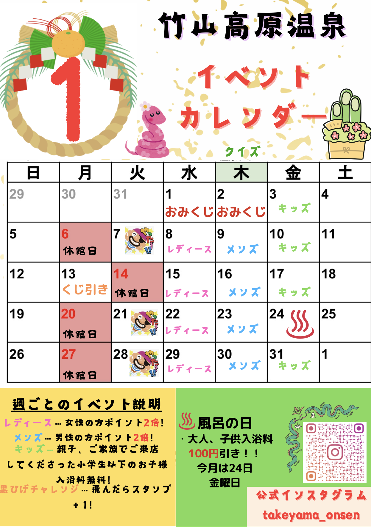 竹山高原温泉では、今年も皆様に楽しいひとときをお届けできるよう努めてまいります。1月のイベントカレンダーをご確認ください。